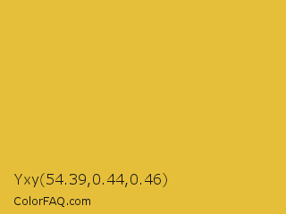 Yxy 54.39,0.44,0.46 Color is a normal yellow color and the nearest color is Meat Brown #e5b73b. Hex code #e6bf3a and RGB value is rgb(230,191,58). In RGB color space, this color is composed of 90% red, 75% green, 23% blue, In CMYK color space, this color is composed of 0% cyan, 17% magenta, 75% yellow , 10% black , In HSL color space, this color has a hue angle of 46° , 77% saturation and 56% lightness.