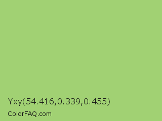 Yxy 54.416,0.339,0.455 Color is a light green color and the nearest color is Pistachio #93c572. Hex code #a1d173 and RGB value is rgb(161,209,115). In RGB color space, this color is composed of 63% red, 82% green, 45% blue, In CMYK color space, this color is composed of 23% cyan, 0% magenta, 45% yellow , 18% black , In HSL color space, this color has a hue angle of 91° , 51% saturation and 64% lightness.