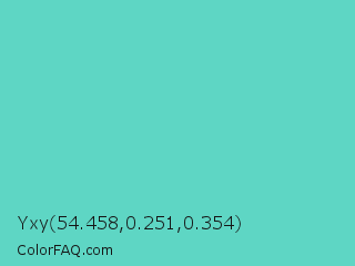 Yxy 54.458,0.251,0.354 Color is a normal cyan color and the nearest color is Downy #6fd0c5. Hex code #5ed6c4 and RGB value is rgb(94,214,196). In RGB color space, this color is composed of 37% red, 84% green, 77% blue, In CMYK color space, this color is composed of 56% cyan, 0% magenta, 8% yellow , 16% black , In HSL color space, this color has a hue angle of 171° , 59% saturation and 60% lightness.