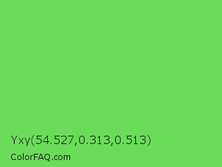 Yxy 54.527,0.313,0.513 Color is a light green color and the nearest color is Mantis #74c365. Hex code #6bdb5a and RGB value is rgb(107,219,90). In RGB color space, this color is composed of 42% red, 86% green, 35% blue, In CMYK color space, this color is composed of 51% cyan, 0% magenta, 59% yellow , 14% black , In HSL color space, this color has a hue angle of 112° , 64% saturation and 61% lightness.