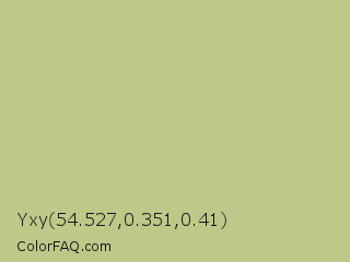 Yxy 54.527,0.351,0.41 Color is a light yellow color and the nearest color is Pine Glade #c7cd90. Hex code #bec989 and RGB value is rgb(190,201,137). In RGB color space, this color is composed of 75% red, 79% green, 54% blue, In CMYK color space, this color is composed of 5% cyan, 0% magenta, 32% yellow , 21% black , In HSL color space, this color has a hue angle of 70° , 37% saturation and 66% lightness.