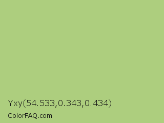 Yxy 54.533,0.343,0.434 Color is a light green color and the nearest color is Feijoa #9fdd8c. Hex code #adce7e and RGB value is rgb(173,206,126). In RGB color space, this color is composed of 68% red, 81% green, 49% blue, In CMYK color space, this color is composed of 16% cyan, 0% magenta, 39% yellow , 19% black , In HSL color space, this color has a hue angle of 85° , 45% saturation and 65% lightness.