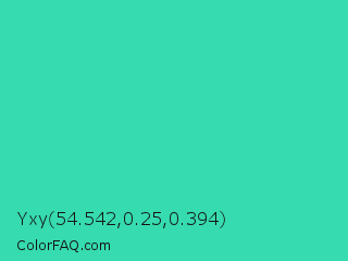 Yxy 54.542,0.25,0.394 Color is a normal cyan color and the nearest color is Eucalyptus #44d7a8. Hex code #36dbaf and RGB value is rgb(54,219,175). In RGB color space, this color is composed of 21% red, 86% green, 69% blue, In CMYK color space, this color is composed of 75% cyan, 0% magenta, 20% yellow , 14% black , In HSL color space, this color has a hue angle of 164° , 70% saturation and 54% lightness.