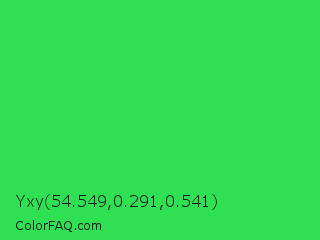 Yxy 54.549,0.291,0.541 Color is a normal green color and the nearest color is Malachite #0bda51. Hex code #2ee052 and RGB value is rgb(46,224,82). In RGB color space, this color is composed of 18% red, 88% green, 32% blue, In CMYK color space, this color is composed of 79% cyan, 0% magenta, 63% yellow , 12% black , In HSL color space, this color has a hue angle of 132° , 74% saturation and 53% lightness.