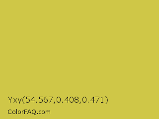Yxy 54.567,0.408,0.471 Color is a normal yellow color and the nearest color is Turmeric #cabb48. Hex code #cfc747 and RGB value is rgb(207,199,71). In RGB color space, this color is composed of 81% red, 78% green, 28% blue, In CMYK color space, this color is composed of 0% cyan, 4% magenta, 66% yellow , 19% black , In HSL color space, this color has a hue angle of 56° , 59% saturation and 55% lightness.