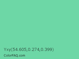 Yxy 54.605,0.274,0.399 Color is a light green color and the nearest color is Medium Aquamarine #66ddaa. Hex code #6dd7a6 and RGB value is rgb(109,215,166). In RGB color space, this color is composed of 43% red, 84% green, 65% blue, In CMYK color space, this color is composed of 49% cyan, 0% magenta, 23% yellow , 16% black , In HSL color space, this color has a hue angle of 152° , 57% saturation and 64% lightness.