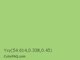 Yxy 54.614,0.338,0.45 Color is a light green color and the nearest color is Pistachio #93c572. Hex code #a2d177 and RGB value is rgb(162,209,119). In RGB color space, this color is composed of 64% red, 82% green, 47% blue, In CMYK color space, this color is composed of 22% cyan, 0% magenta, 43% yellow , 18% black , In HSL color space, this color has a hue angle of 91° , 49% saturation and 64% lightness.