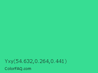 Yxy 54.632,0.264,0.441 Color is a normal green color and the nearest color is Shamrock #33cc99. Hex code #37dd93 and RGB value is rgb(55,221,147). In RGB color space, this color is composed of 22% red, 87% green, 58% blue, In CMYK color space, this color is composed of 75% cyan, 0% magenta, 33% yellow , 13% black , In HSL color space, this color has a hue angle of 153° , 71% saturation and 54% lightness.
