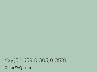 Yxy 54.659,0.305,0.353 Color is a light green color and the nearest color is Spring Rain #accbb1. Hex code #afcab7 and RGB value is rgb(175,202,183). In RGB color space, this color is composed of 69% red, 79% green, 72% blue, In CMYK color space, this color is composed of 13% cyan, 0% magenta, 9% yellow , 21% black , In HSL color space, this color has a hue angle of 138° , 20% saturation and 74% lightness.