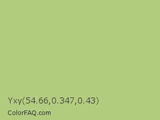 Yxy 54.66,0.347,0.43 Color is a light green color and the nearest color is Wild Willow #b9c46a. Hex code #b2cd7f and RGB value is rgb(178,205,127). In RGB color space, this color is composed of 70% red, 80% green, 50% blue, In CMYK color space, this color is composed of 13% cyan, 0% magenta, 38% yellow , 20% black , In HSL color space, this color has a hue angle of 81° , 44% saturation and 65% lightness.