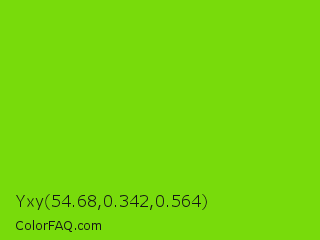Yxy 54.68,0.342,0.564 Color is a normal green color and the nearest color is Alien Armpit #84de02. Hex code #78db0b and RGB value is rgb(120,219,11). In RGB color space, this color is composed of 47% red, 86% green, 4% blue, In CMYK color space, this color is composed of 45% cyan, 0% magenta, 95% yellow , 14% black , In HSL color space, this color has a hue angle of 89° , 90% saturation and 45% lightness.