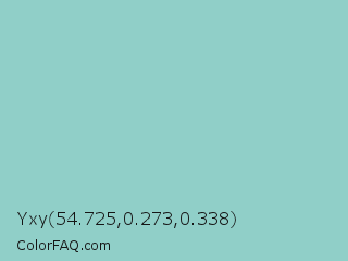 Yxy 54.725,0.273,0.338 Color is a light cyan color and the nearest color is Middle Blue Green #8dd9cc. Hex code #90cfc8 and RGB value is rgb(144,207,200). In RGB color space, this color is composed of 56% red, 81% green, 78% blue, In CMYK color space, this color is composed of 30% cyan, 0% magenta, 3% yellow , 19% black , In HSL color space, this color has a hue angle of 173° , 40% saturation and 69% lightness.