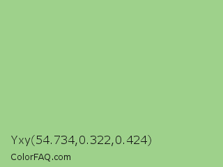 Yxy 54.734,0.322,0.424 Color is a light green color and the nearest color is Feijoa #9fdd8c. Hex code #9ed18b and RGB value is rgb(158,209,139). In RGB color space, this color is composed of 62% red, 82% green, 55% blue, In CMYK color space, this color is composed of 24% cyan, 0% magenta, 33% yellow , 18% black , In HSL color space, this color has a hue angle of 104° , 43% saturation and 68% lightness.
