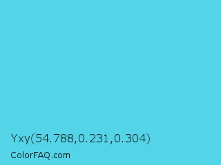 Yxy 54.788,0.231,0.304 Color is a light cyan color and the nearest color is Viking #64ccdb. Hex code #54d4e7 and RGB value is rgb(84,212,231). In RGB color space, this color is composed of 33% red, 83% green, 91% blue, In CMYK color space, this color is composed of 64% cyan, 8% magenta, 0% yellow , 9% black , In HSL color space, this color has a hue angle of 188° , 75% saturation and 62% lightness.
