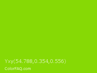 Yxy 54.788,0.354,0.556 Color is a normal green color and the nearest color is Alien Armpit #84de02. Hex code #87d905 and RGB value is rgb(135,217,5). In RGB color space, this color is composed of 53% red, 85% green, 2% blue, In CMYK color space, this color is composed of 38% cyan, 0% magenta, 98% yellow , 15% black , In HSL color space, this color has a hue angle of 83° , 95% saturation and 44% lightness.