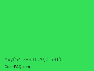 Yxy 54.789,0.29,0.531 Color is a normal green color and the nearest color is UFO Green #3cd070. Hex code #35e059 and RGB value is rgb(53,224,89). In RGB color space, this color is composed of 21% red, 88% green, 35% blue, In CMYK color space, this color is composed of 76% cyan, 0% magenta, 60% yellow , 12% black , In HSL color space, this color has a hue angle of 133° , 73% saturation and 54% lightness.