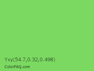 Yxy 54.7,0.32,0.498 Color is a light green color and the nearest color is Pastel Green #77dd77. Hex code #7bd961 and RGB value is rgb(123,217,97). In RGB color space, this color is composed of 48% red, 85% green, 38% blue, In CMYK color space, this color is composed of 43% cyan, 0% magenta, 55% yellow , 15% black , In HSL color space, this color has a hue angle of 107° , 61% saturation and 62% lightness.