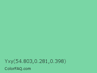 Yxy 54.803,0.281,0.398 Color is a light green color and the nearest color is Medium Aquamarine #66ddaa. Hex code #79d6a5 and RGB value is rgb(121,214,165). In RGB color space, this color is composed of 47% red, 84% green, 65% blue, In CMYK color space, this color is composed of 43% cyan, 0% magenta, 23% yellow , 16% black , In HSL color space, this color has a hue angle of 148° , 53% saturation and 66% lightness.
