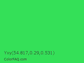 Yxy 54.817,0.29,0.531 Color is a normal green color and the nearest color is UFO Green #3cd070. Hex code #35e059 and RGB value is rgb(53,224,89). In RGB color space, this color is composed of 21% red, 88% green, 35% blue, In CMYK color space, this color is composed of 76% cyan, 0% magenta, 60% yellow , 12% black , In HSL color space, this color has a hue angle of 133° , 73% saturation and 54% lightness.