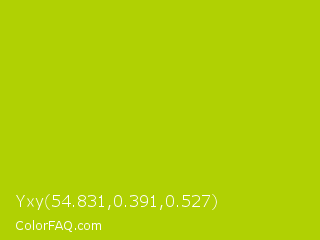 Yxy 54.831,0.391,0.527 Color is a normal yellow color and the nearest color is Vivid Lime Green #a6d608. Hex code #b0d103 and RGB value is rgb(176,209,3). In RGB color space, this color is composed of 69% red, 82% green, 1% blue, In CMYK color space, this color is composed of 16% cyan, 0% magenta, 99% yellow , 18% black , In HSL color space, this color has a hue angle of 70° , 97% saturation and 42% lightness.