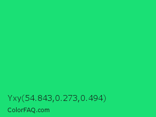 Yxy 54.843,0.273,0.494 Color is a normal green color and the nearest color is UFO Green #3cd070. Hex code #1ae075 and RGB value is rgb(26,224,117). In RGB color space, this color is composed of 10% red, 88% green, 46% blue, In CMYK color space, this color is composed of 88% cyan, 0% magenta, 48% yellow , 12% black , In HSL color space, this color has a hue angle of 148° , 79% saturation and 49% lightness.