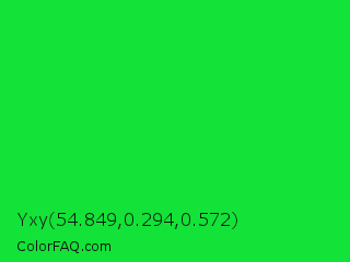 Yxy 54.849,0.294,0.572 Color is a normal green color and the nearest color is Malachite #0bda51. Hex code #13e238 and RGB value is rgb(19,226,56). In RGB color space, this color is composed of 7% red, 89% green, 22% blue, In CMYK color space, this color is composed of 92% cyan, 0% magenta, 75% yellow , 11% black , In HSL color space, this color has a hue angle of 131° , 84% saturation and 48% lightness.