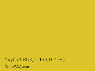 Yxy 54.863,0.433,0.478 Color is a normal yellow color and the nearest color is Sunflower #e4d422. Hex code #dcc42b and RGB value is rgb(220,196,43). In RGB color space, this color is composed of 86% red, 77% green, 17% blue, In CMYK color space, this color is composed of 0% cyan, 11% magenta, 80% yellow , 14% black , In HSL color space, this color has a hue angle of 52° , 72% saturation and 52% lightness.