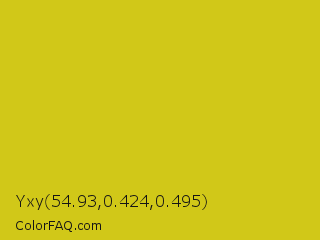 Yxy 54.93,0.424,0.495 Color is a normal yellow color and the nearest color is Bird Flower #d4cd16. Hex code #d1c818 and RGB value is rgb(209,200,24). In RGB color space, this color is composed of 82% red, 78% green, 9% blue, In CMYK color space, this color is composed of 0% cyan, 4% magenta, 89% yellow , 18% black , In HSL color space, this color has a hue angle of 57° , 79% saturation and 46% lightness.