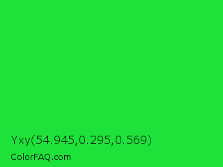 Yxy 54.945,0.295,0.569 Color is a normal green color and the nearest color is Lime Green #32cd32. Hex code #1ee23a and RGB value is rgb(30,226,58). In RGB color space, this color is composed of 12% red, 89% green, 23% blue, In CMYK color space, this color is composed of 87% cyan, 0% magenta, 74% yellow , 11% black , In HSL color space, this color has a hue angle of 129° , 77% saturation and 50% lightness.