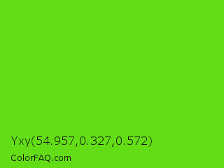 Yxy 54.957,0.327,0.572 Color is a normal green color and the nearest color is Harlequin Green #46cb18. Hex code #63de16 and RGB value is rgb(99,222,22). In RGB color space, this color is composed of 39% red, 87% green, 9% blue, In CMYK color space, this color is composed of 55% cyan, 0% magenta, 90% yellow , 13% black , In HSL color space, this color has a hue angle of 97° , 82% saturation and 48% lightness.
