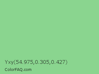 Yxy 54.975,0.305,0.427 Color is a light green color and the nearest color is Granny Smith Apple Crayola #9de093. Hex code #8ad58f and RGB value is rgb(138,213,143). In RGB color space, this color is composed of 54% red, 84% green, 56% blue, In CMYK color space, this color is composed of 35% cyan, 0% magenta, 33% yellow , 16% black , In HSL color space, this color has a hue angle of 124° , 47% saturation and 69% lightness.