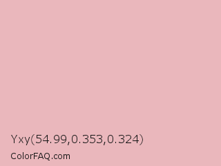 Yxy 54.99,0.353,0.324 Color is a very light red color and the nearest color is Shilo #e8b9b3. Hex code #eab7bc and RGB value is rgb(234,183,188). In RGB color space, this color is composed of 92% red, 72% green, 74% blue, In CMYK color space, this color is composed of 0% cyan, 22% magenta, 20% yellow , 8% black , In HSL color space, this color has a hue angle of 354° , 55% saturation and 82% lightness.