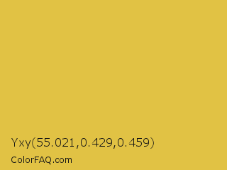 Yxy 55.021,0.429,0.459 Color is a normal yellow color and the nearest color is Anzac #e0b646. Hex code #e1c244 and RGB value is rgb(225,194,68). In RGB color space, this color is composed of 88% red, 76% green, 27% blue, In CMYK color space, this color is composed of 0% cyan, 14% magenta, 70% yellow , 12% black , In HSL color space, this color has a hue angle of 48° , 72% saturation and 57% lightness.