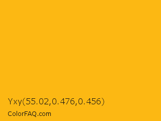 Yxy 55.02,0.476,0.456 Color is a normal orange color and the nearest color is Sun #fbac13. Hex code #fcb813 and RGB value is rgb(252,184,19). In RGB color space, this color is composed of 99% red, 72% green, 7% blue, In CMYK color space, this color is composed of 0% cyan, 27% magenta, 92% yellow , 1% black , In HSL color space, this color has a hue angle of 42° , 97% saturation and 53% lightness.