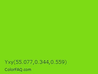 Yxy 55.077,0.344,0.559 Color is a normal green color and the nearest color is Alien Armpit #84de02. Hex code #7ddb15 and RGB value is rgb(125,219,21). In RGB color space, this color is composed of 49% red, 86% green, 8% blue, In CMYK color space, this color is composed of 43% cyan, 0% magenta, 90% yellow , 14% black , In HSL color space, this color has a hue angle of 88° , 83% saturation and 47% lightness.