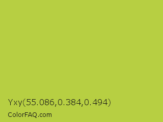 Yxy 55.086,0.384,0.494 Color is a normal yellow color and the nearest color is Conifer #acdd4d. Hex code #b7cf42 and RGB value is rgb(183,207,66). In RGB color space, this color is composed of 72% red, 81% green, 26% blue, In CMYK color space, this color is composed of 12% cyan, 0% magenta, 68% yellow , 19% black , In HSL color space, this color has a hue angle of 70° , 59% saturation and 54% lightness.