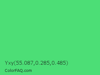 Yxy 55.087,0.285,0.485 Color is a normal green color and the nearest color is UFO Green #3cd070. Hex code #4cde76 and RGB value is rgb(76,222,118). In RGB color space, this color is composed of 30% red, 87% green, 46% blue, In CMYK color space, this color is composed of 66% cyan, 0% magenta, 47% yellow , 13% black , In HSL color space, this color has a hue angle of 137° , 69% saturation and 58% lightness.