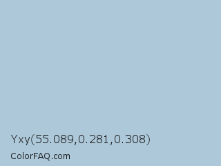 Yxy 55.089,0.281,0.308 Color is a light blue color and the nearest color is Light Steel Blue #b0c4de. Hex code #adc8d9 and RGB value is rgb(173,200,217). In RGB color space, this color is composed of 68% red, 78% green, 85% blue, In CMYK color space, this color is composed of 20% cyan, 8% magenta, 0% yellow , 15% black , In HSL color space, this color has a hue angle of 203° , 37% saturation and 76% lightness.