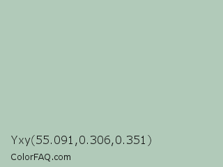 Yxy 55.091,0.306,0.351 Color is a light green color and the nearest color is Spring Rain #accbb1. Hex code #b1cab9 and RGB value is rgb(177,202,185). In RGB color space, this color is composed of 69% red, 79% green, 73% blue, In CMYK color space, this color is composed of 12% cyan, 0% magenta, 8% yellow , 21% black , In HSL color space, this color has a hue angle of 139° , 19% saturation and 74% lightness.