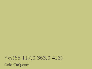 Yxy 55.117,0.363,0.413 Color is a light yellow color and the nearest color is Pine Glade #c7cd90. Hex code #c7c884 and RGB value is rgb(199,200,132). In RGB color space, this color is composed of 78% red, 78% green, 52% blue, In CMYK color space, this color is composed of 1% cyan, 0% magenta, 34% yellow , 22% black , In HSL color space, this color has a hue angle of 61° , 38% saturation and 65% lightness.