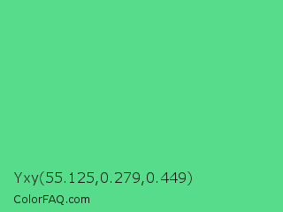 Yxy 55.125,0.279,0.449 Color is a normal green color and the nearest color is Very Light Malachite Green #64e986. Hex code #57dc8b and RGB value is rgb(87,220,139). In RGB color space, this color is composed of 34% red, 86% green, 55% blue, In CMYK color space, this color is composed of 60% cyan, 0% magenta, 37% yellow , 14% black , In HSL color space, this color has a hue angle of 143° , 66% saturation and 60% lightness.