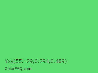 Yxy 55.129,0.294,0.489 Color is a light green color and the nearest color is Emerald #50c878. Hex code #5bdd71 and RGB value is rgb(91,221,113). In RGB color space, this color is composed of 36% red, 87% green, 44% blue, In CMYK color space, this color is composed of 59% cyan, 0% magenta, 49% yellow , 13% black , In HSL color space, this color has a hue angle of 130° , 66% saturation and 61% lightness.