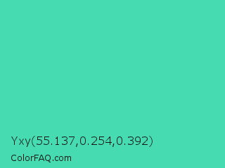 Yxy 55.137,0.254,0.392 Color is a normal green color and the nearest color is Eucalyptus #44d7a8. Hex code #46dbb0 and RGB value is rgb(70,219,176). In RGB color space, this color is composed of 27% red, 86% green, 69% blue, In CMYK color space, this color is composed of 68% cyan, 0% magenta, 20% yellow , 14% black , In HSL color space, this color has a hue angle of 163° , 67% saturation and 57% lightness.