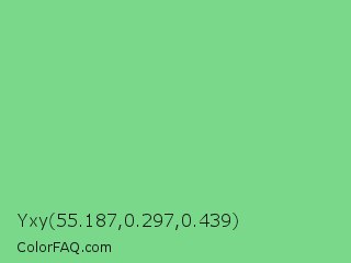 Yxy 55.187,0.297,0.439 Color is a light green color and the nearest color is De York #7ac488. Hex code #7ad88b and RGB value is rgb(122,216,139). In RGB color space, this color is composed of 48% red, 85% green, 55% blue, In CMYK color space, this color is composed of 44% cyan, 0% magenta, 36% yellow , 15% black , In HSL color space, this color has a hue angle of 131° , 55% saturation and 66% lightness.