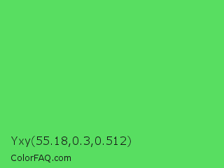 Yxy 55.18,0.3,0.512 Color is a light green color and the nearest color is Emerald #50c878. Hex code #58de61 and RGB value is rgb(88,222,97). In RGB color space, this color is composed of 35% red, 87% green, 38% blue, In CMYK color space, this color is composed of 60% cyan, 0% magenta, 56% yellow , 13% black , In HSL color space, this color has a hue angle of 124° , 67% saturation and 61% lightness.