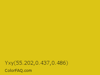 Yxy 55.202,0.437,0.486 Color is a normal yellow color and the nearest color is Gold Tips #deba13. Hex code #dcc515 and RGB value is rgb(220,197,21). In RGB color space, this color is composed of 86% red, 77% green, 8% blue, In CMYK color space, this color is composed of 0% cyan, 10% magenta, 90% yellow , 14% black , In HSL color space, this color has a hue angle of 53° , 83% saturation and 47% lightness.