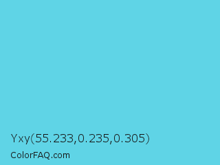 Yxy 55.233,0.235,0.305 Color is a light cyan color and the nearest color is Turquoise Blue #6cdae7. Hex code #5fd4e6 and RGB value is rgb(95,212,230). In RGB color space, this color is composed of 37% red, 83% green, 90% blue, In CMYK color space, this color is composed of 59% cyan, 8% magenta, 0% yellow , 10% black , In HSL color space, this color has a hue angle of 188° , 73% saturation and 64% lightness.