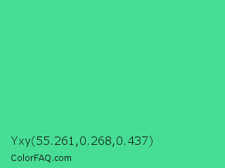 Yxy 55.261,0.268,0.437 Color is a normal green color and the nearest color is Eucalyptus #44d7a8. Hex code #47dd95 and RGB value is rgb(71,221,149). In RGB color space, this color is composed of 28% red, 87% green, 58% blue, In CMYK color space, this color is composed of 68% cyan, 0% magenta, 33% yellow , 13% black , In HSL color space, this color has a hue angle of 151° , 69% saturation and 57% lightness.