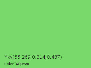 Yxy 55.269,0.314,0.487 Color is a light green color and the nearest color is Pastel Green #77dd77. Hex code #79da6b and RGB value is rgb(121,218,107). In RGB color space, this color is composed of 47% red, 85% green, 42% blue, In CMYK color space, this color is composed of 44% cyan, 0% magenta, 51% yellow , 15% black , In HSL color space, this color has a hue angle of 112° , 60% saturation and 64% lightness.