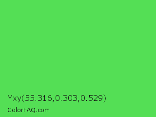Yxy 55.316,0.303,0.529 Color is a normal green color and the nearest color is UFO Green #3cd070. Hex code #54df55 and RGB value is rgb(84,223,85). In RGB color space, this color is composed of 33% red, 87% green, 33% blue, In CMYK color space, this color is composed of 62% cyan, 0% magenta, 62% yellow , 13% black , In HSL color space, this color has a hue angle of 120° , 68% saturation and 60% lightness.
